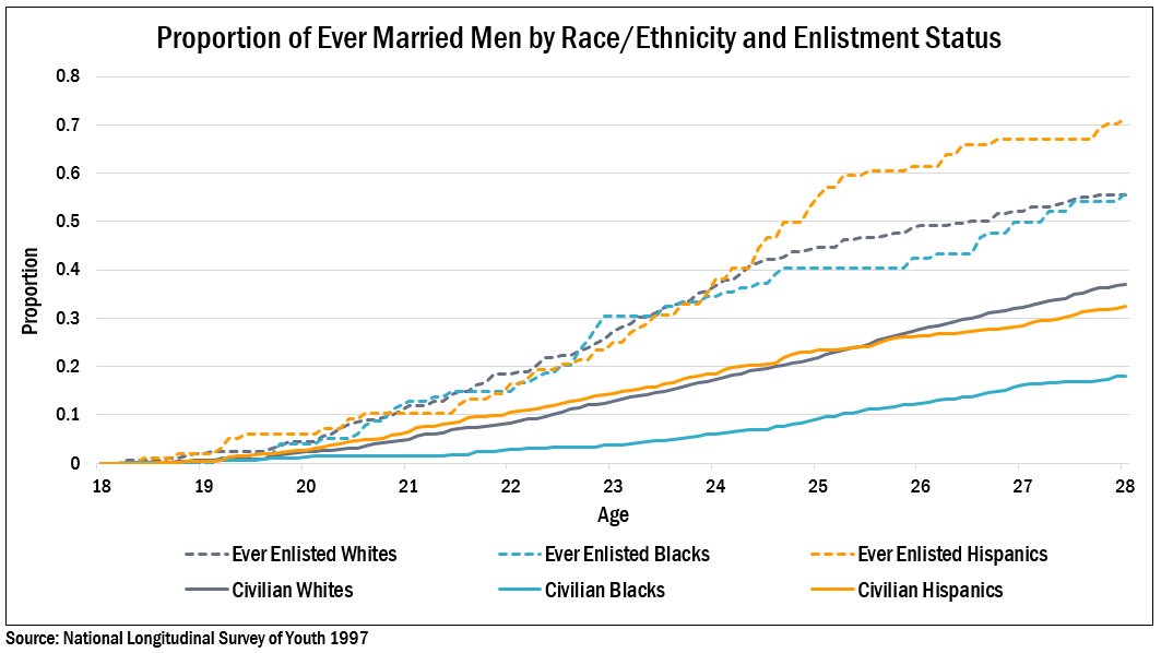 That's a tweet which I probably could have better incorporated in this post. Anyhow, the graph shows the marriage rates for whites, Hispanics and blacks, divided between "ever enlisted" and "civilians". What caught my eye were the rates for enlisted blacks, very much the same as enlisted whites, and enlisted Hispanics, significantly higher than enlisted whites and blacks. The rates for all enlisteds were significantly above those for civilians.